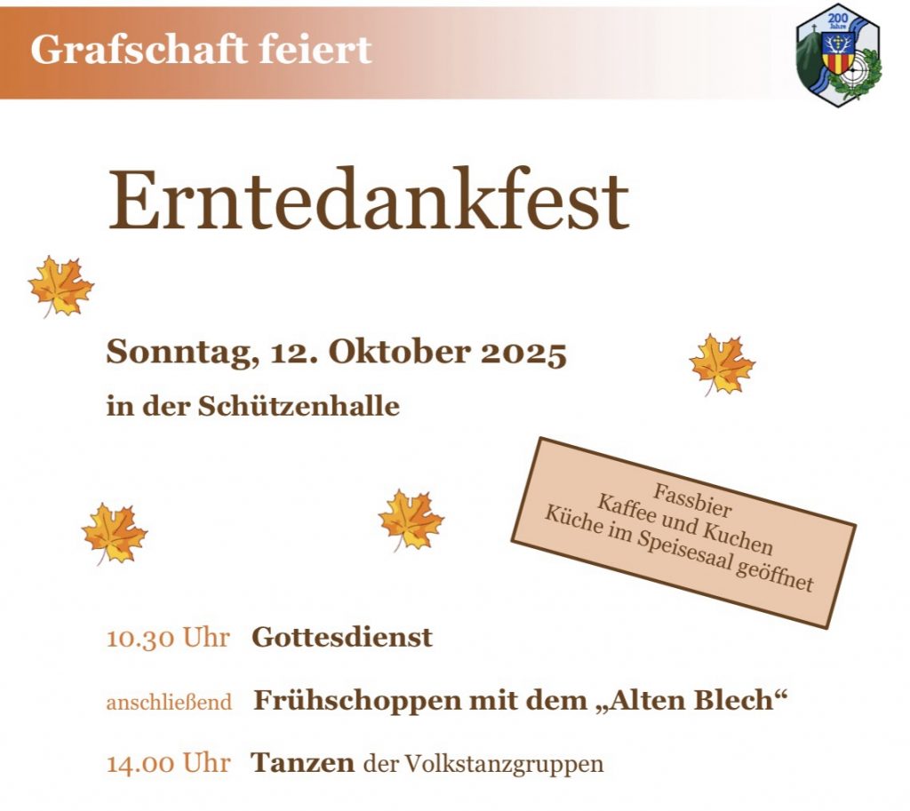 - Erntedankfest in GrafschaftDie Schützenbruderschaft lädt herzlich ein zum diesjährigen Erntedankfest 🗓️ am Sonntag, 12.10.2025 🕦 ab 10.30 Uhr ➡️ in der Schützenhalle. Das Fest beginnt um 10:30 Uhr mit einem Dankgottesdienst in der Schützenhalle. Direkt nach der Messe spielt das „Alte Blech“ zum Frühschoppen auf. Mittags muss niemand zum Essen nach Hause, da im Speisesaal einige schmackhafte… Erntedankfest in Grafschaft weiterlesen