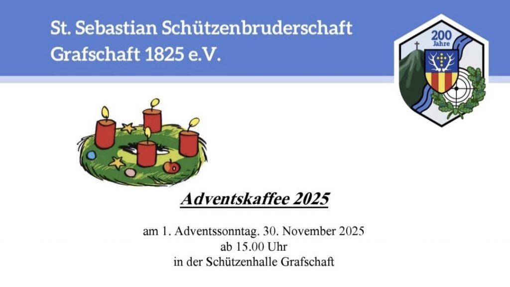 Zum traditionellen Adventskaffee lädt die St. Sebastian Schützenbruderschaft Grafschaft alle älteren Einheimischen unserer Orte herzlich ein. Beginn ist am 1. Adventssonntag, 30. November 2025 um 15.00 Uhr in der Grafschafter Schützenhalle. - Gemeinsames Innehalten der Vereine zum Volkstrauertag