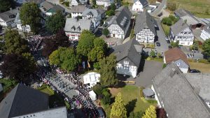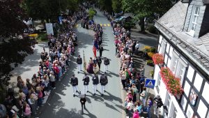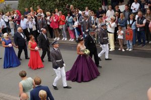 Wenig später trafen bereits die ersten eingeladenen Gastvereine und Musiken an der Schützenhalle in der Schulstraße ein, wo sich pünktlich um 14.30 Uhr der aus drei Zügen bestehende Große Festzug in Gang setzte. Knapp 1.000 Teilnehmerinnen und Teilnehmer sorgten für ein imposantes Bild. Am Haus des Gastes wurde der neue Kaiser Helmut Dohle, den seine Tochter Sabine als Kaiserin begleitete, und der aus ehemaligen Königen bestehende Hofstaat abgeholt. Bei sommerlichen Kaiserwetter führte der Festzug durch das Klostergelände, um sich im Dorf abermals den Zuschauern zu präsentieren, die die Straße auf beiden Seiten in mehreren Reihen säumten. Nach der Kehrtwende in der Nähe der Ortsausfahrt Oberkirchen erfolgte vor dem Hof Höwer (Olbes) ein Vorbeimarsch zu Ehren des neuen Kaisers und seines Hofstaates.