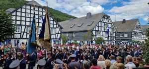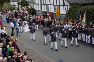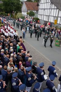 Am Sonntagmorgen traten die Schützen in der Dorfmitte am Haus des Gastes an, um zum Schützenhochamt in die Pfarrkirche zu marschieren. Nach der von Pastor Stipp gehaltenen Messe führte der Weg zurück zum Dorfbrunnen, wo der Musikverein Berghausen ein Frühschoppenkonzert spielte.