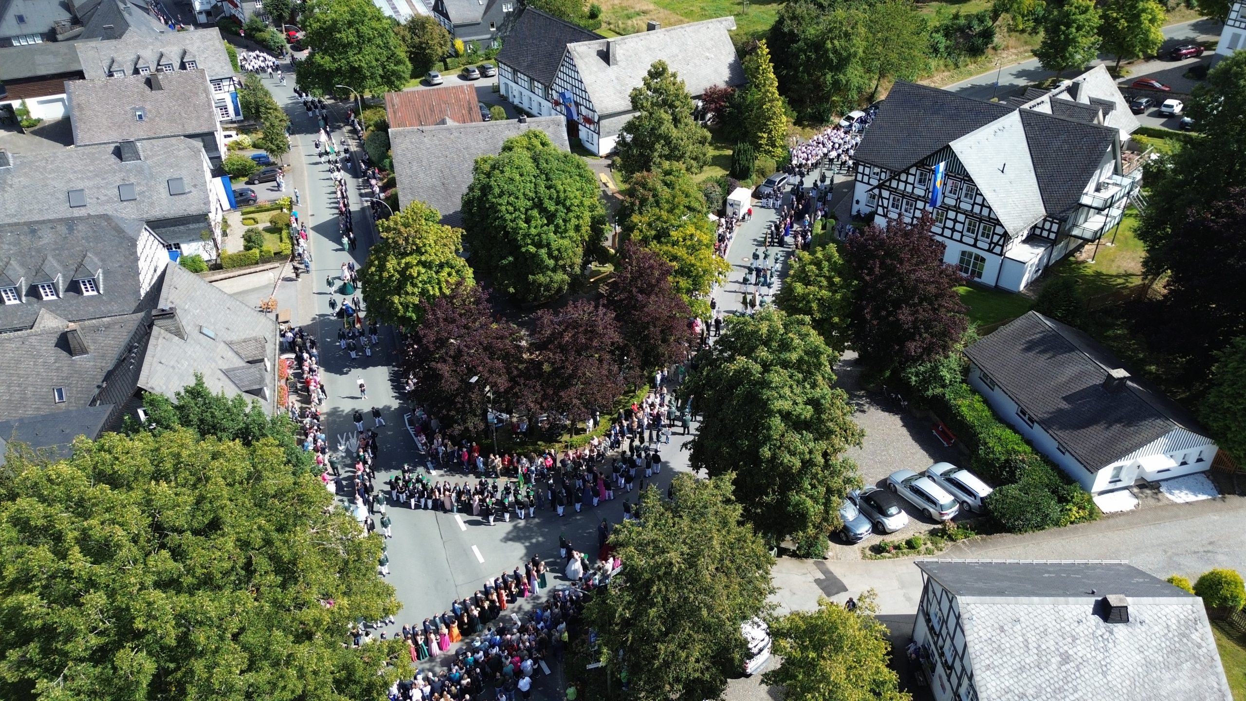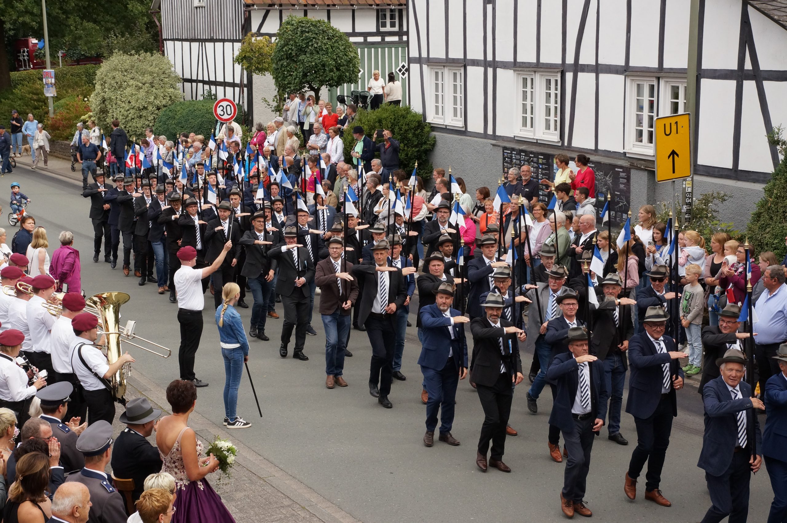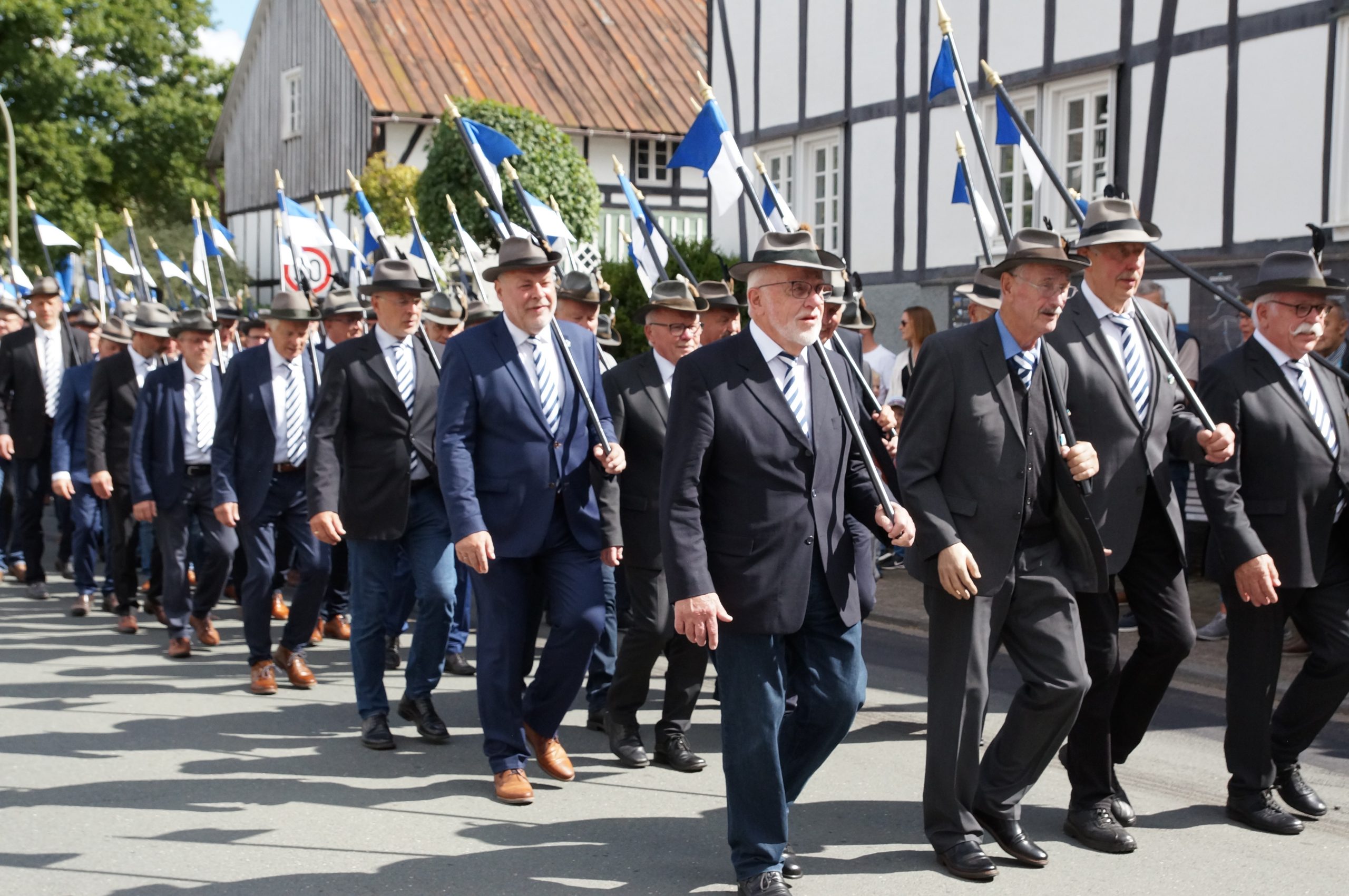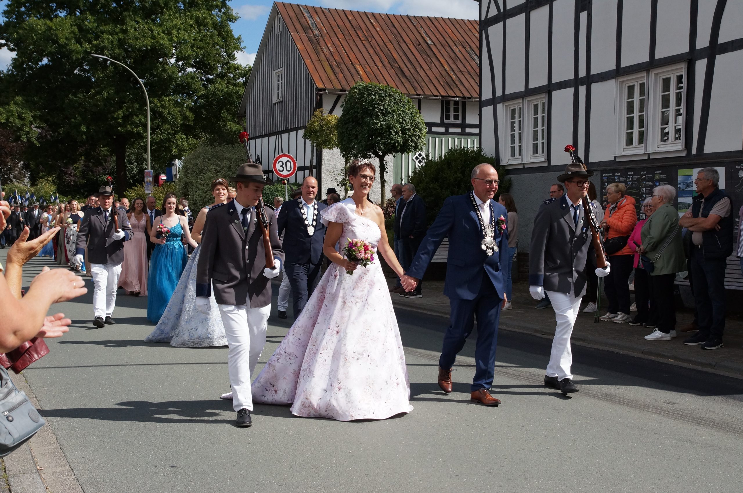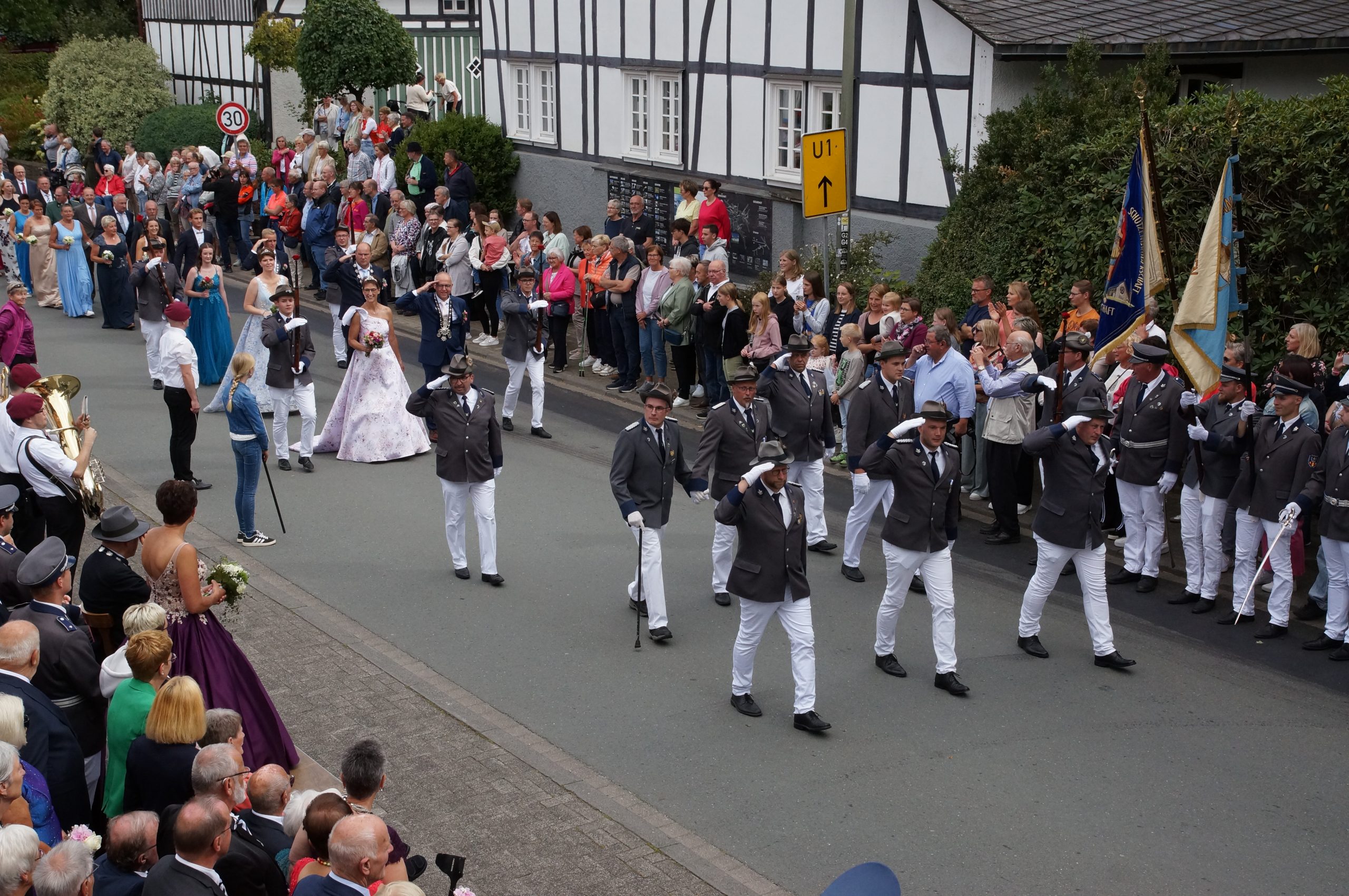 Wenig später trafen bereits die ersten eingeladenen Gastvereine und Musiken an der Schützenhalle in der Schulstraße ein, wo sich pünktlich um 14.30 Uhr der aus drei Zügen bestehende Große Festzug in Gang setzte. Knapp 1.000 Teilnehmerinnen und Teilnehmer sorgten für ein imposantes Bild. Am Haus des Gastes wurde der neue Kaiser Helmut Dohle, den seine Tochter Sabine als Kaiserin begleitete, und der aus ehemaligen Königen bestehende Hofstaat abgeholt. Bei sommerlichen Kaiserwetter führte der Festzug durch das Klostergelände, um sich im Dorf abermals den Zuschauern zu präsentieren, die die Straße auf beiden Seiten in mehreren Reihen säumten. Nach der Kehrtwende in der Nähe der Ortsausfahrt Oberkirchen erfolgte vor dem Hof Höwer (Olbes) ein Vorbeimarsch zu Ehren des neuen Kaisers und seines Hofstaates.
